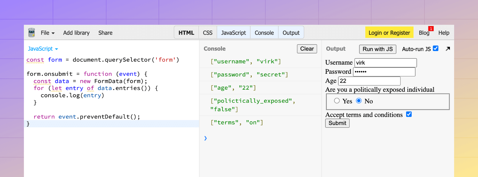 Here's a demo showcasing serialized form data of what we have covered so far. https://jsbin.com/detixawaxa/edit?html,js,console,output