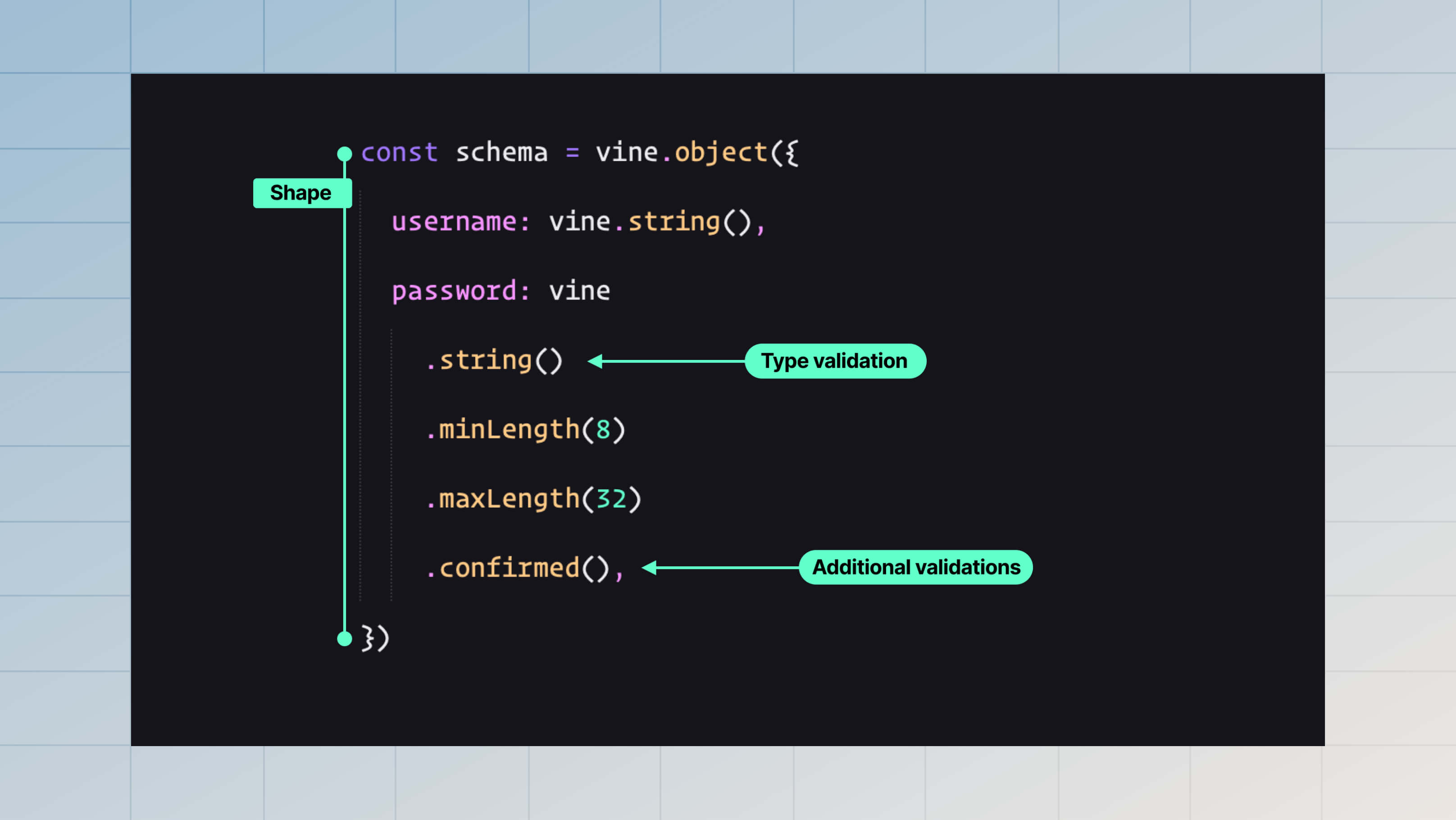 vine.string,vine.boolean, and so on. - Additional validations and mutations are applied using the rules available on a given schema type.